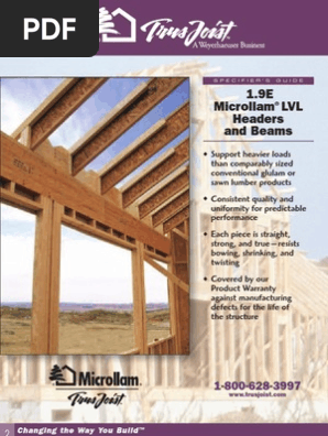 Header details 24 25 nailing on narrow face 25 allowable. Microllam lvl 18 19 parallam psl 20 21 snow roof load tables timberstrand lsl 22 23 microllam lvl 24 25 parallam psl 26 27 non snow roof load tables timberstrand lsl 28 29 microllam lvl 30 31 parallam psl 32 33 beam details 34 window and door header details 34 35 nailing on narrow face 35 allowable holes 36. Engineered wood products ewp lvl span and size charts. A word about lvl grades lvl user s guide 3 west fraser timber product line 4 storage handling installation 4 3100fb2 0e west fraser lvl 5 1 and 3 thick design properties 6 factored resistance table 7 8.
